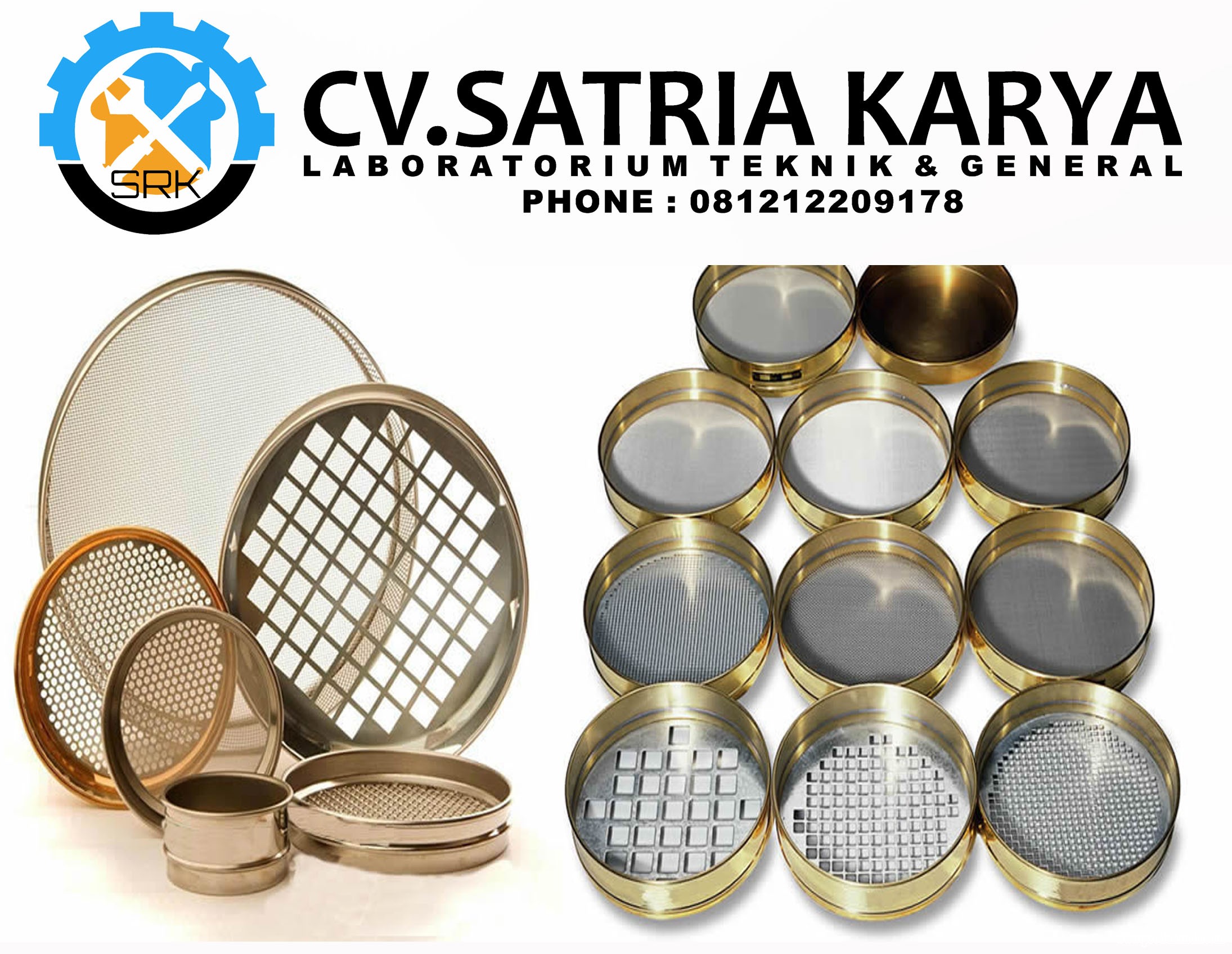 Sieve analysis alat untuk menentukan persentase berat butiran agregat yang lolos dari satu set sieve. adapun untuk ukuran mesh yang tersedia antara lain Brass Sieve Dia. 8? # 4? Brass wire mesh 101.6 mm opening Brass Sieve Dia. 8? # 3 1/ 2? Brass wire mesh 88.9 mm opening Brass Sieve Dia. 8? # 3? Brass wire mesh 76.2 mm opening Brass Sieve Dia. 8? # 2 1/ 2? Brass wire mesh 62.5 mm opening Brass Sieve Dia. 8? # 2? Brass wire mesh 50.8 mm opening Brass Sieve Dia. 8? # 1 3/ 4? Brass wire mesh 44.4 mm opening Brass Sieve Dia. 8? # 1 1/ 2? Brass wire mesh 38.1 mm opening Brass Sieve Dia. 8? # 1 1/ 4? Brass wire mesh 31.7 mm opening Brass Sieve Dia. 8? # 1? Brass wire mesh 25.4 mm opening Brass Sieve Dia. 8? # 7/ 8? Brass wire mesh 22.2 mm opening Brass Sieve Dia. 8? # 3/ 4? Brass wire mesh 19.0 mm opening Brass Sieve Dia. 8? # 5/ 8? Brass wire mesh 15.8 mm opening Brass Sieve Dia. 8? # 1/ 2? Brass wire mesh 12.7 mm opening Brass Sieve Dia. 8? # 7/ 16? Brass wire mesh 11.1 mm opening Brass Sieve Dia. 8? # 3/ 8? Brass wire mesh 9.5 mm opening Brass Sieve Dia. 8? # 5/ 16? Brass wire mesh 7.9 mm opening Brass Sieve Dia. 8? # 1/ 4? Brass wire mesh 6.3 mm opening Brass Sieve Dia. 8? # 4 Brass wire mesh 4.75 mm opening Brass Sieve Dia. 8? # 8 Stainless stell mesh 2.36 mm opening Brass Sieve Dia. 8? # 10 Stainless stell mesh 2.00 mm opening Brass Sieve Dia. 8? # 12 Stainless stell mesh 1.70 mm opening Brass Sieve Dia. 8? # 16 Stainless stell mesh 1.18 mm opening Brass Sieve Dia. 8? # 20 Stainless stell mesh 0.850 mm opening Brass Sieve Dia. 8? # 30 Stainless stell mesh 0.600 mm opening Brass Sieve Dia. 8? # 40 Stainless stell mesh 0.425 mm opening Brass Sieve Dia. 8? # 50 Stainless stell mesh 0.300 mm opening Brass Sieve Dia. 8? # 60 Stainless stell mesh 0.250 mm opening Brass Sieve Dia. 8? # 70 Stainless stell mesh 0.212 mm opening Brass Sieve Dia. 8? # 80 Stainless stell mesh 0.180 mm opening Brass Sieve Dia. 8? # 100 Stainless stell mesh 0.150 mm opening Brass Sieve Dia. 8? # 120 Stainless stell mesh 0.125 mm opening Brass Sieve Dia. 8? # 140 Stainless stell mesh 0.106 mm opening Brass Sieve Dia. 8? # 170 Stainless stell mesh 0.090 mm opening Brass Sieve Dia. 8? # 200 Stainless stell mesh 0.075 mm opening Brass Pan and Cover Diameter 8?..